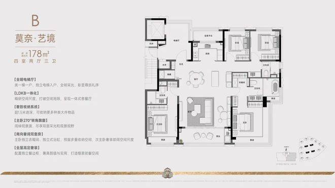 建面约178方四房两厅三卫:这款户型,则站在追求品质改善人群的角度,做出了